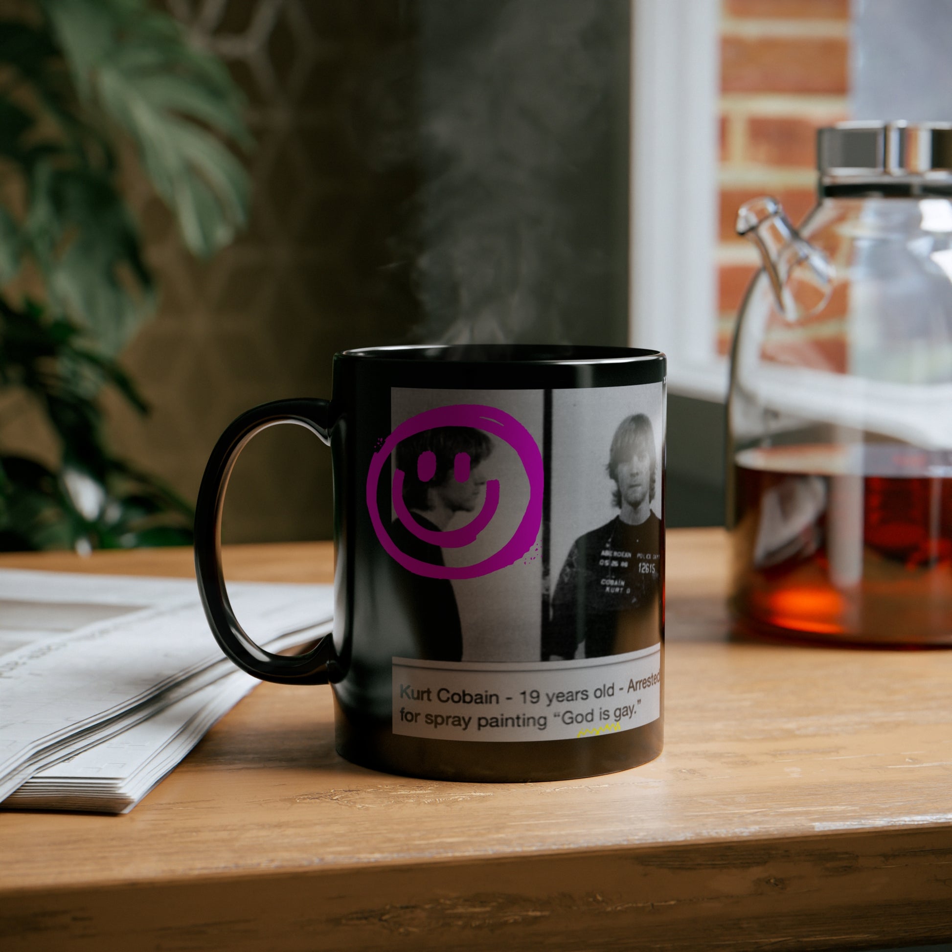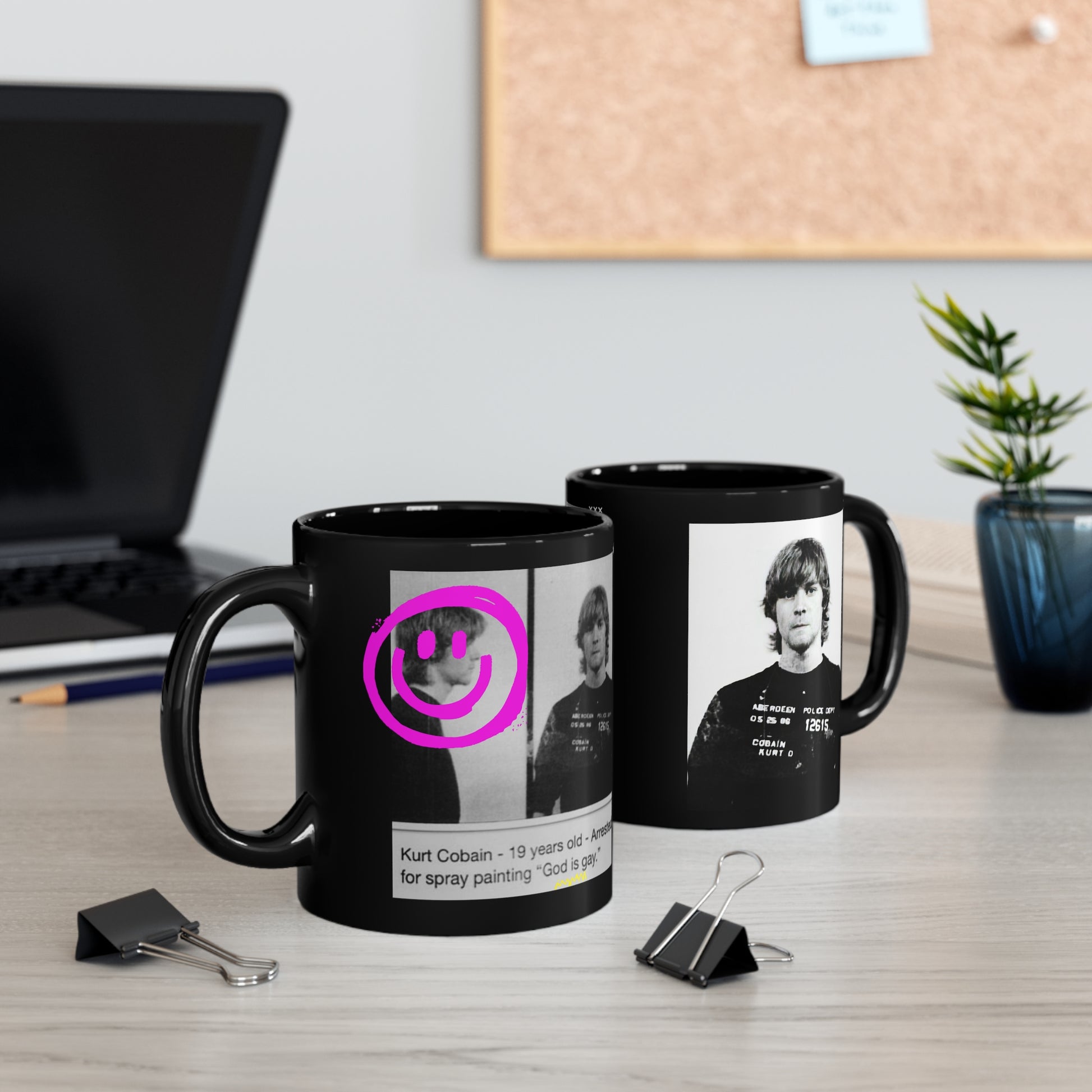 This 11-ounce ceramic mug features an iconic image of Kurt Cobain, captured during his arrest for spray painting "God is gay." Embrace the raw and unapologetic essence of grunge culture every time you sip your favorite brew.